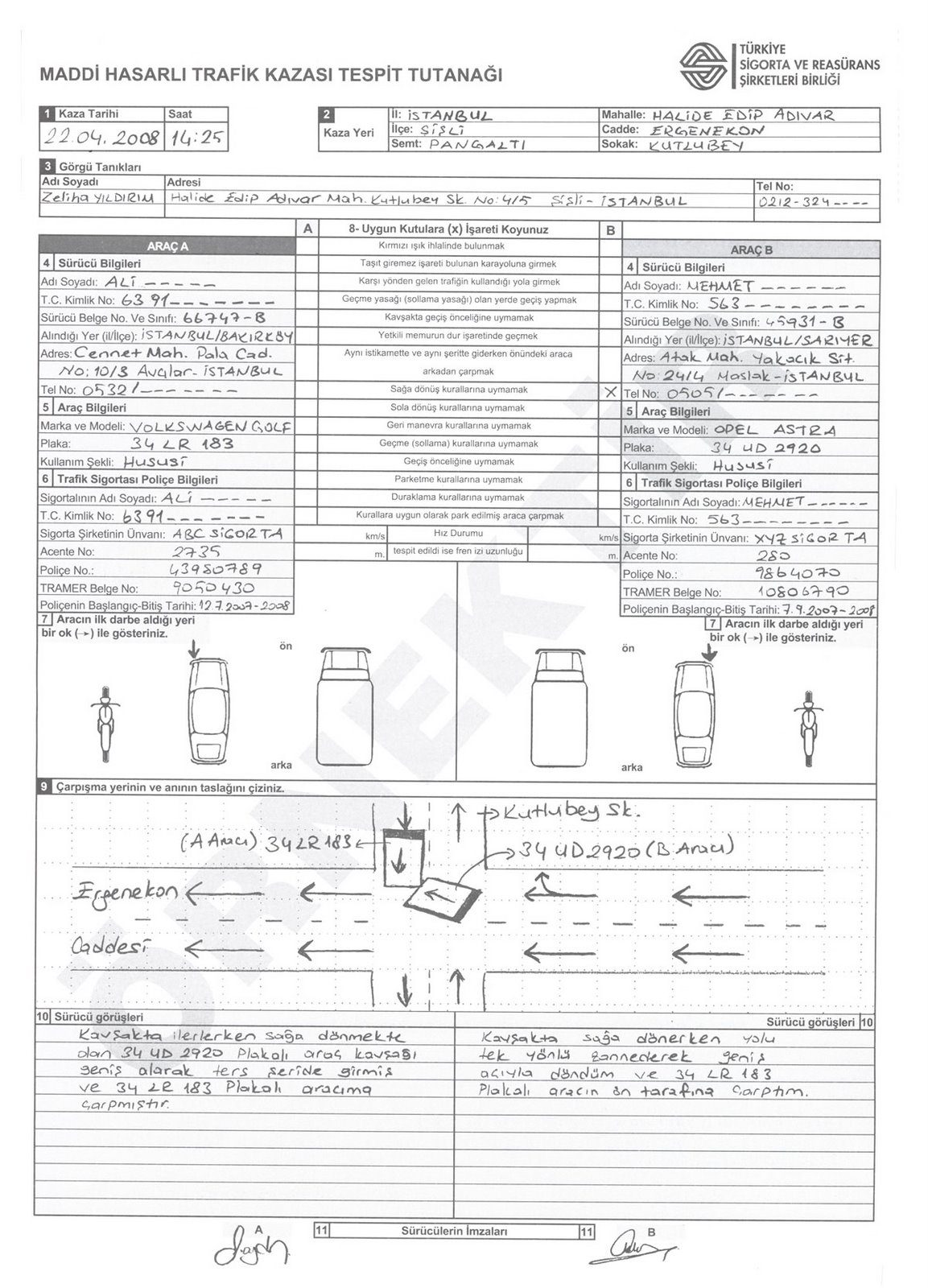 Kaza Tespit Tutanağı örneği için tıklayınız